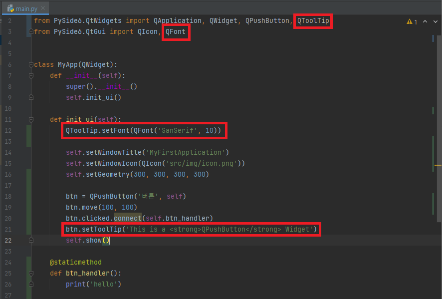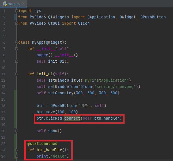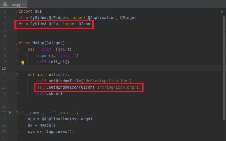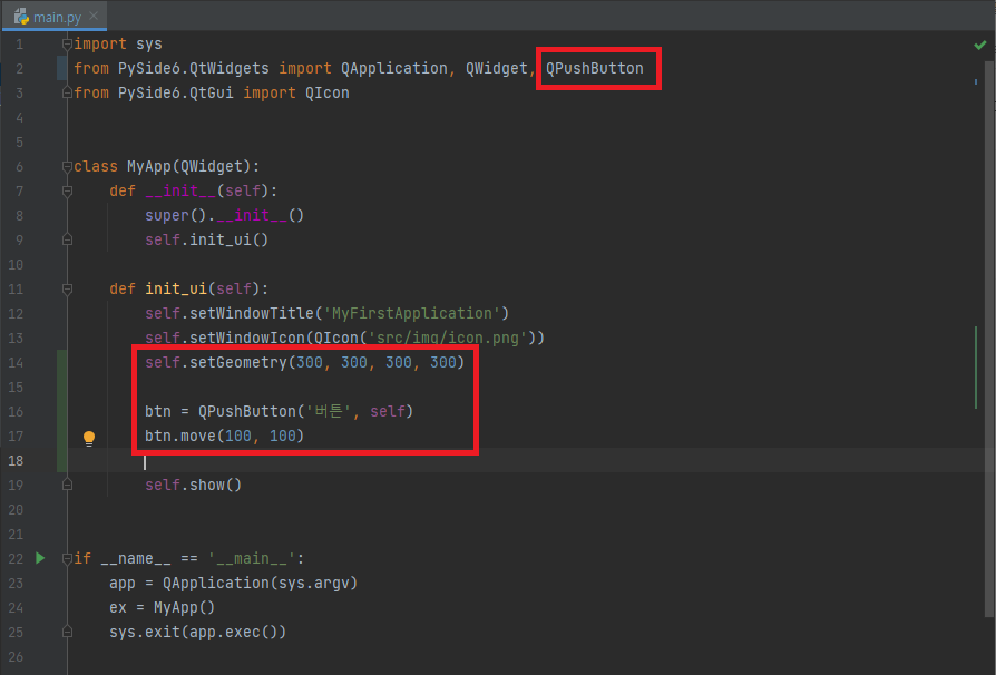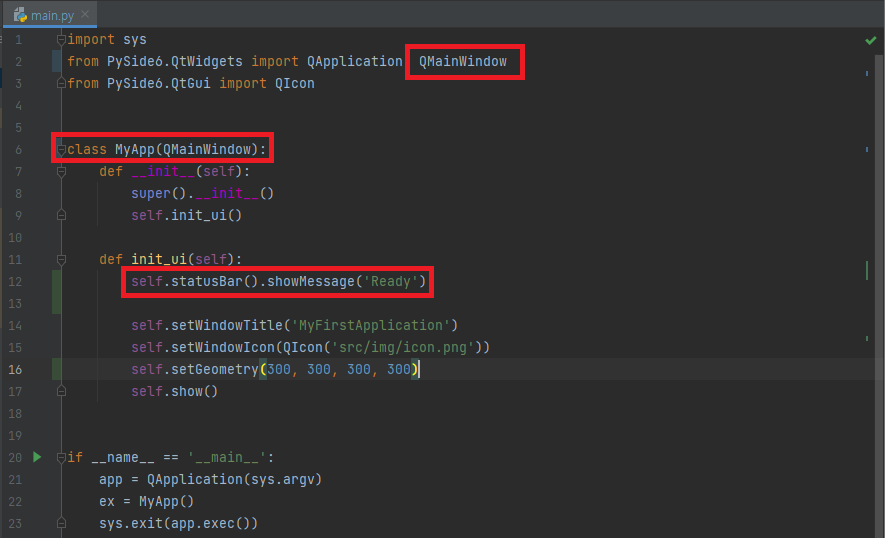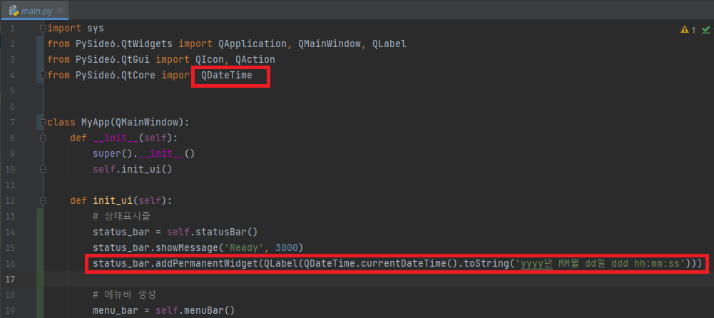 QMainWindow 위젯을 import 하고 MyApp 이 QWidget 대신 QMainWindow 를 상속하도록 변경한다.