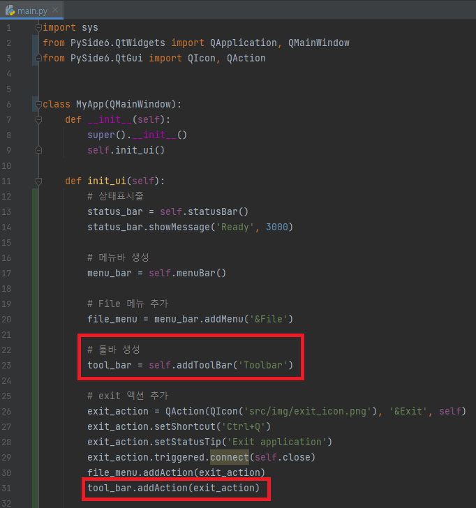 self.addToolBar 를 호출하여 툴바를 생성해준 뒤 메뉴에 추가하기 위해 만들었던 exit_action을 툴바에 추가해준다.