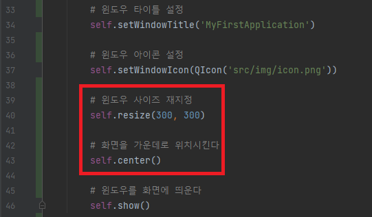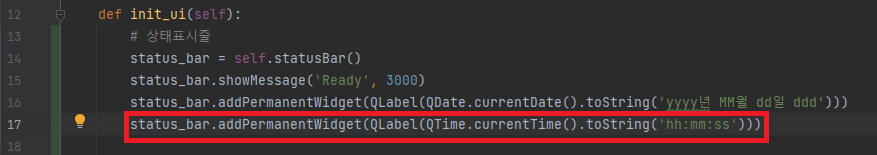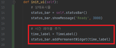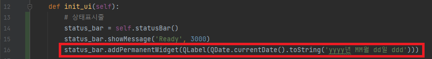 self.statusBar().showMessage 메소드를 호출하여 Ready 라는 메시지를 상태표시줄에 출력하도록 해보자.