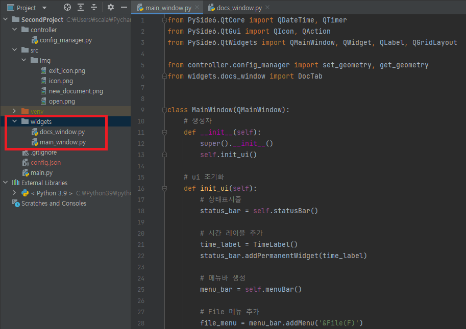 QMainWindow 위젯은 우리가 일반적으로 보게되는 윈도우 애플리케이션의 기본프레임을 갖춘 위젯이다.