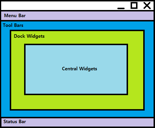 메인 윈도우는 위와 같이 Menu Bar, Tool Bars, Dock Widgets, Central Widgets, Status Bar 의 영역들을 가지고있다.
